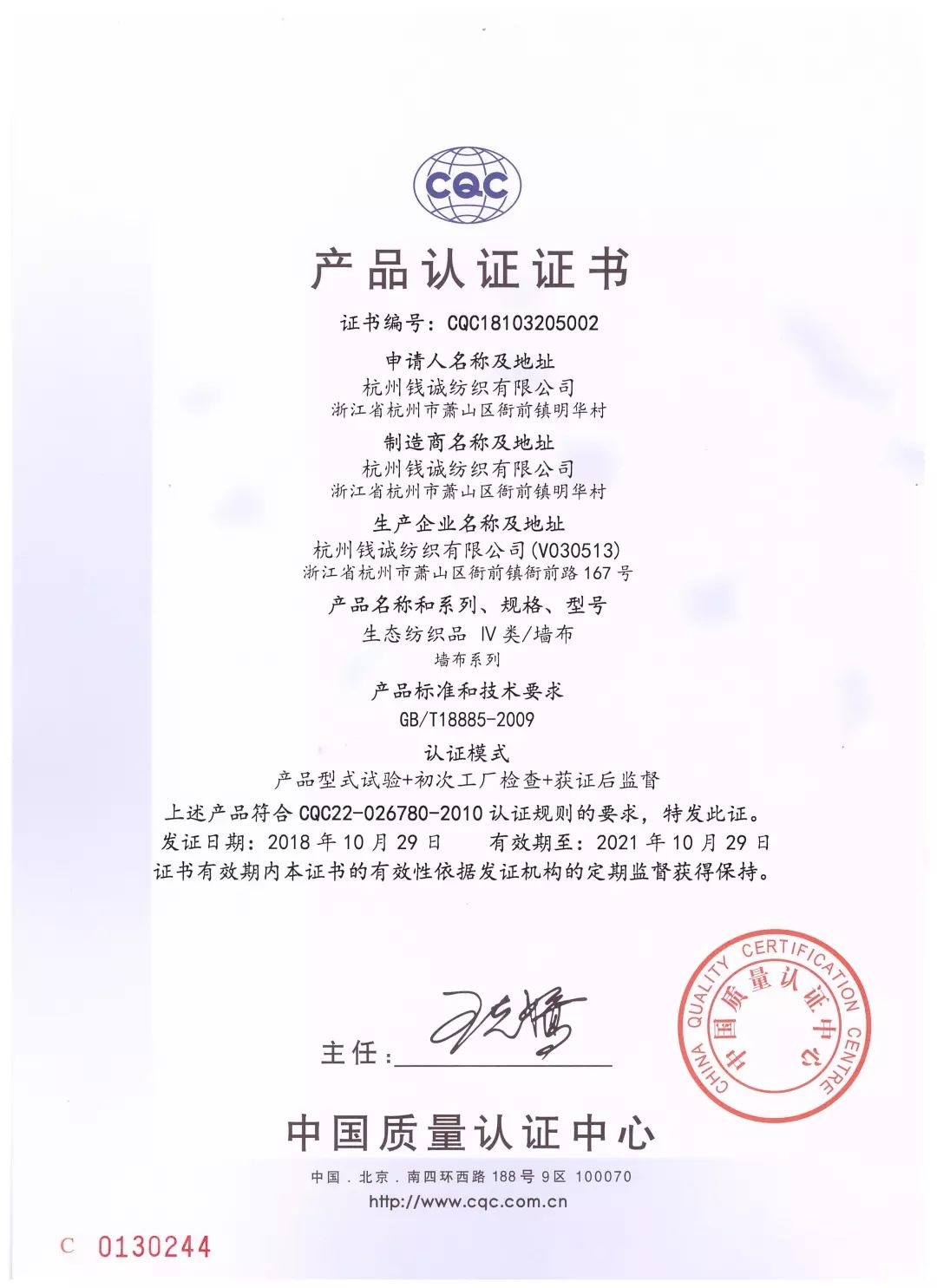 2018年10月29日,中国质量认证中心(以下统称“CQC”)向美家美户?无缝墙布颁发中国生态墙布系列产品认证证书。美家美户再度率行业之先,继ISO14001环境管理体系认证,ISO9001质量管理体系认证证书后,成为首批获得CQC生态墙布系列认证的品牌,成功引领行业开启墙布系列强制认证时代。美家美户再次以实际行动,彰显了行业领导品牌的卓越实力。